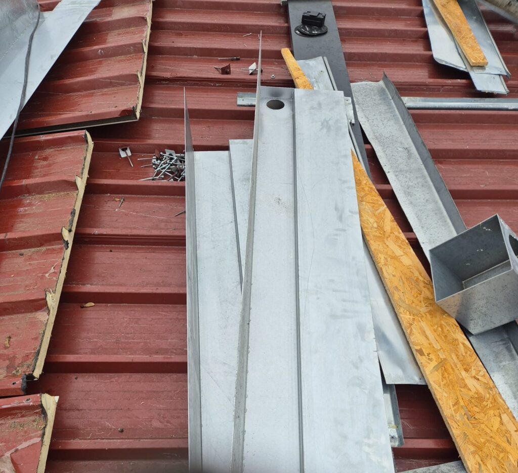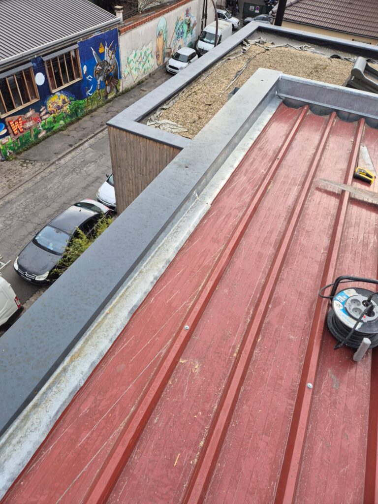 Sur ce chantier récent, nos équipes sont intervenues pour sécuriser et pérenniser la rive d’une toiture technique. Ce projet illustre notre expertise dans le façonnage et la pose d’éléments de zinguerie sur mesure : le remplacement d’un chéneau avec ourlet et la pose d’une couvertine avec recouvrement.