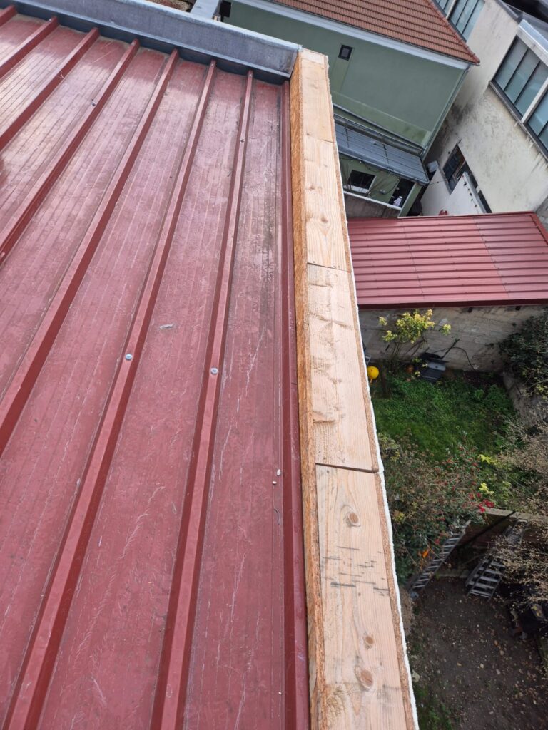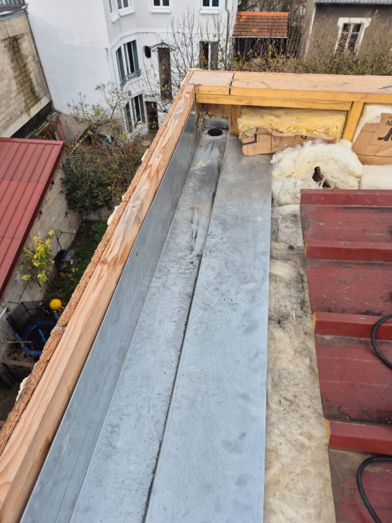 La première étape a consisté à préparer l’assise en bois (souvent en OSB ou bois massif) destinée à recevoir les éléments métalliques. Comme on le voit sur les photos de préparation, ce support doit être parfaitement plan et présenter une légère pente pour diriger l’eau vers le chéneau.